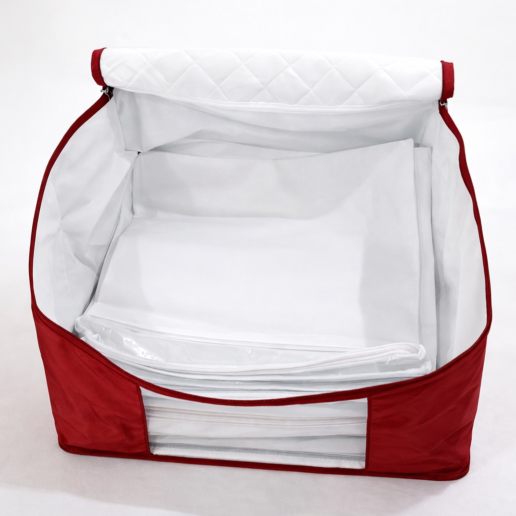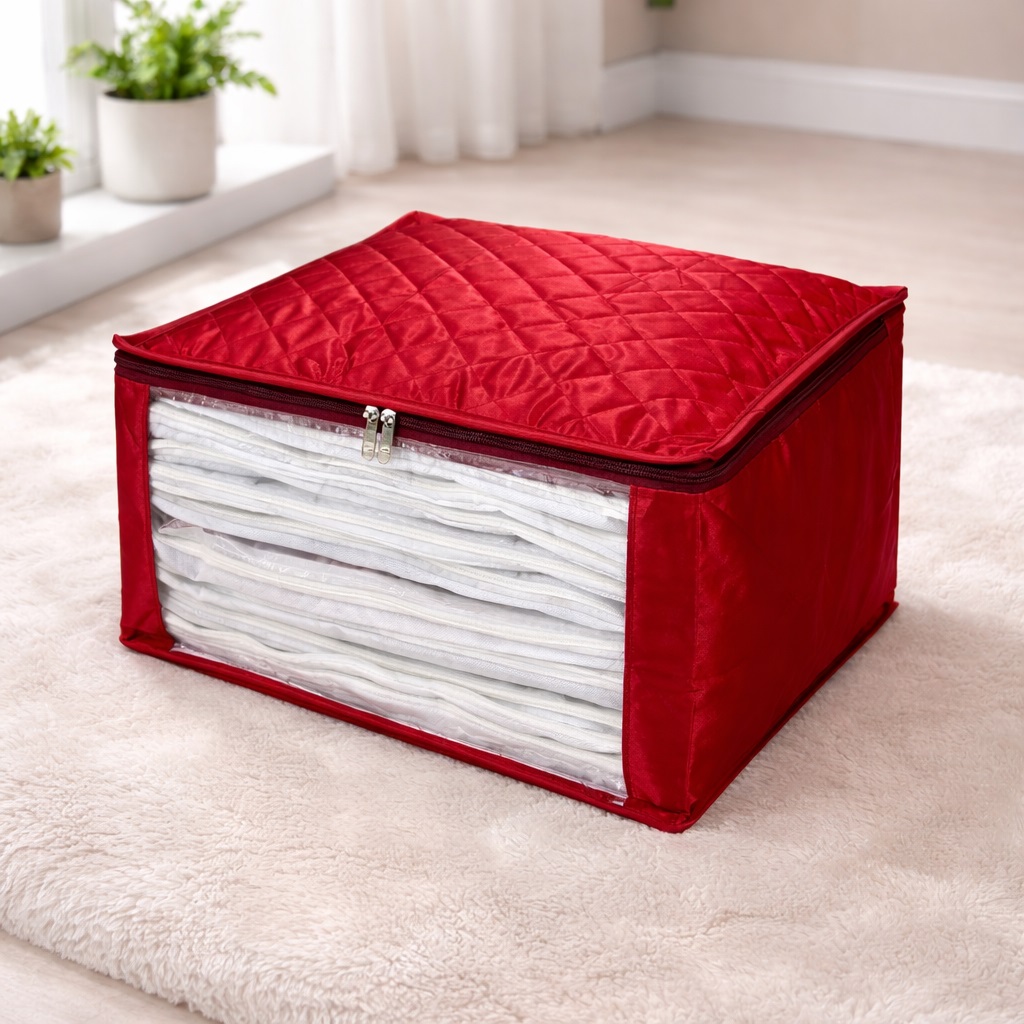 Store your treasured sarees with elegance using this 12-Flap Saree Organizer with Premium Satin Storage Box. Thoughtfully designed individual transparent flaps keep each saree neatly separated, protected from dust, and easy to access without disturbing the stack. The luxurious quilted satin box with clear viewing window adds both durability and sophistication to your wardrobe storage. A perfect solution to preserve, organize, and showcase your saree collection with care and style.