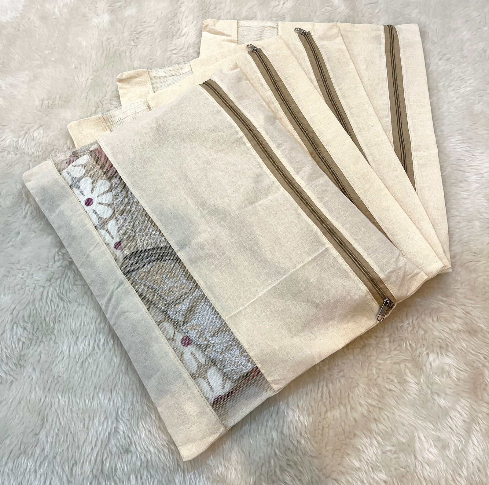 Preserve your finest sarees with our Organic Cotton Saree Cover, crafted from pure cotton with a breathable cotton net panel for visibility. Each cover measures 17 x 13.5 inches and features a secure zipper closure, weighing just 50 grams for effortless storage. Available in convenient multi-packs of 10 pieces, these covers protect your treasured collection from dust and damage while maintaining fabric integrity. Ideal for organized wardrobes and gifting.