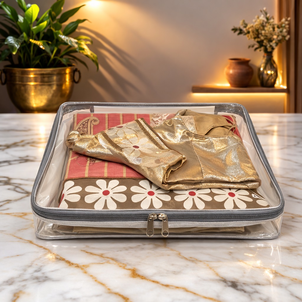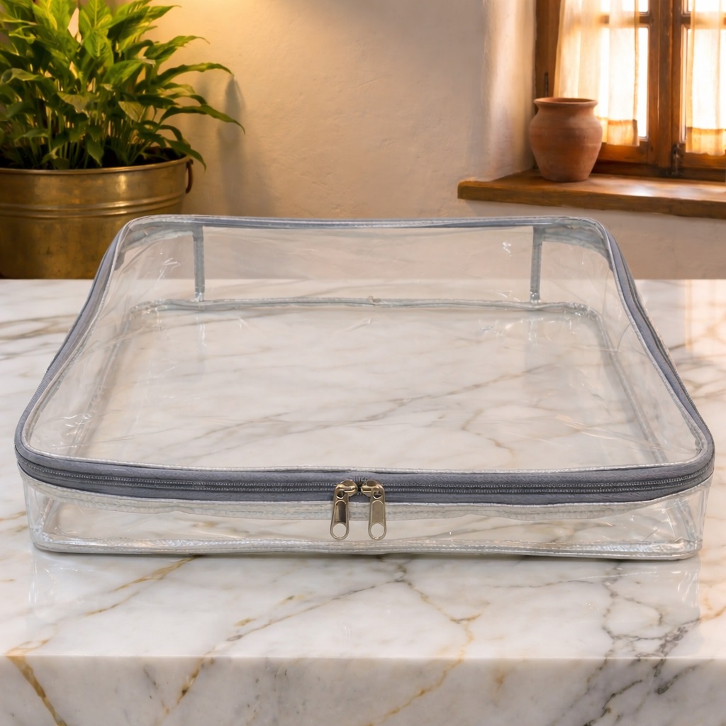 Keep your complete saree sets safe and organized with this dependable transparent cover. Made from sturdy 0.30mm PVC material, it delivers crystal-clear visibility so you can easily identify your collection at a glance. The compact 13.5 x 16.75 x 2 inch design fits perfectly in your wardrobe while holding everything you need—saree, petticoat, blouse, and accessories all together. Weighing just 150 grams, it’s easy to handle and store. This practical solution helps protect your precious fabrics from dust and damage while keeping your storage space neat and accessible.