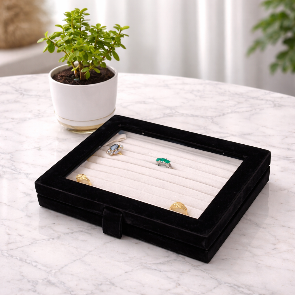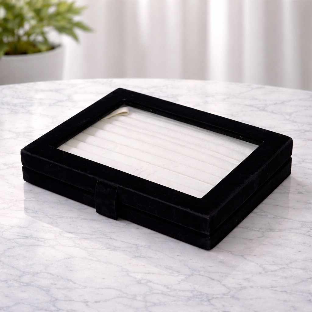 A refined black velvet ring organizer designed to showcase and protect your jewelry with timeless elegance. The soft velvet slots securely hold multiple rings while the transparent lid allows effortless viewing and selection. Perfect for dressing tables or retail displays, it combines luxury aesthetics with practical organization.