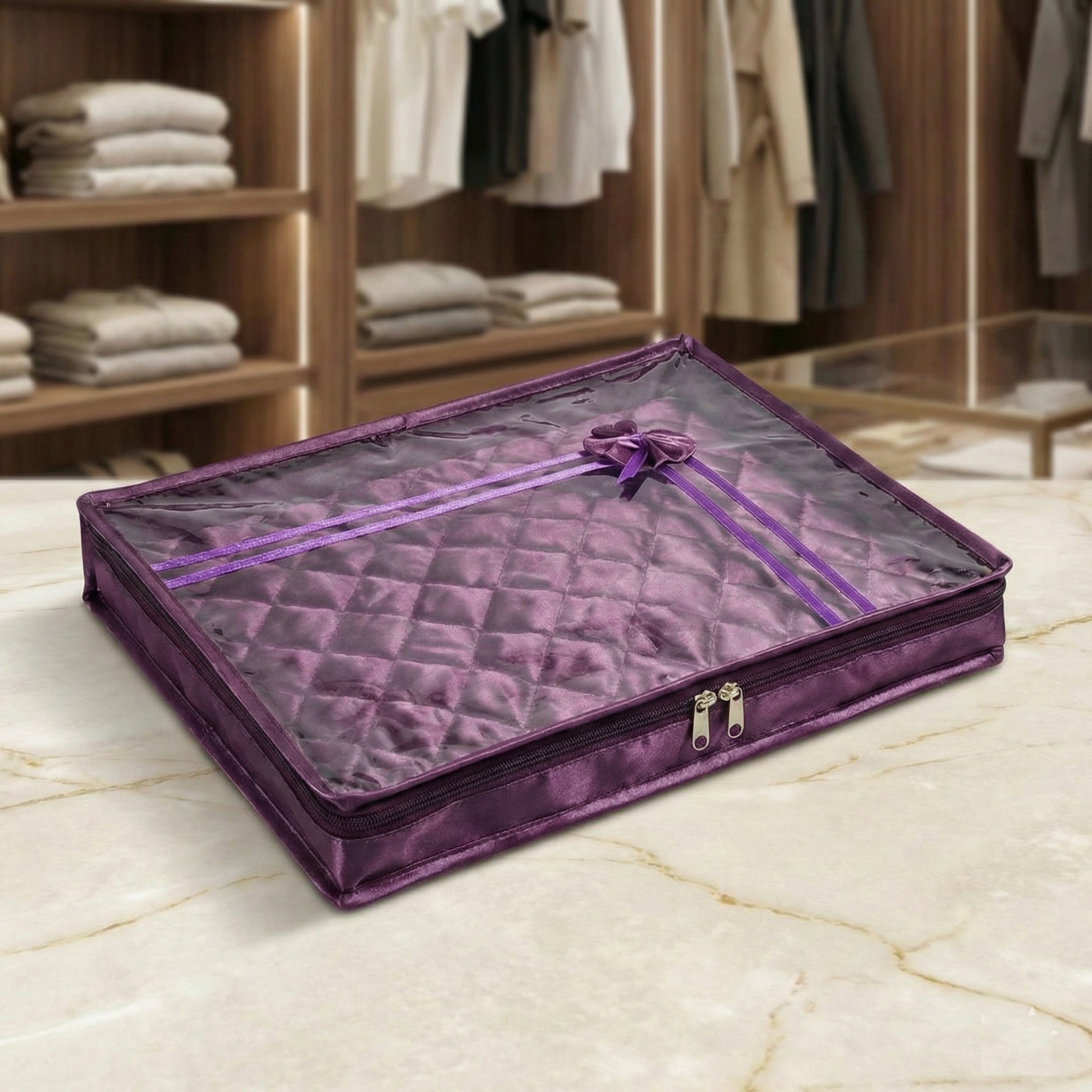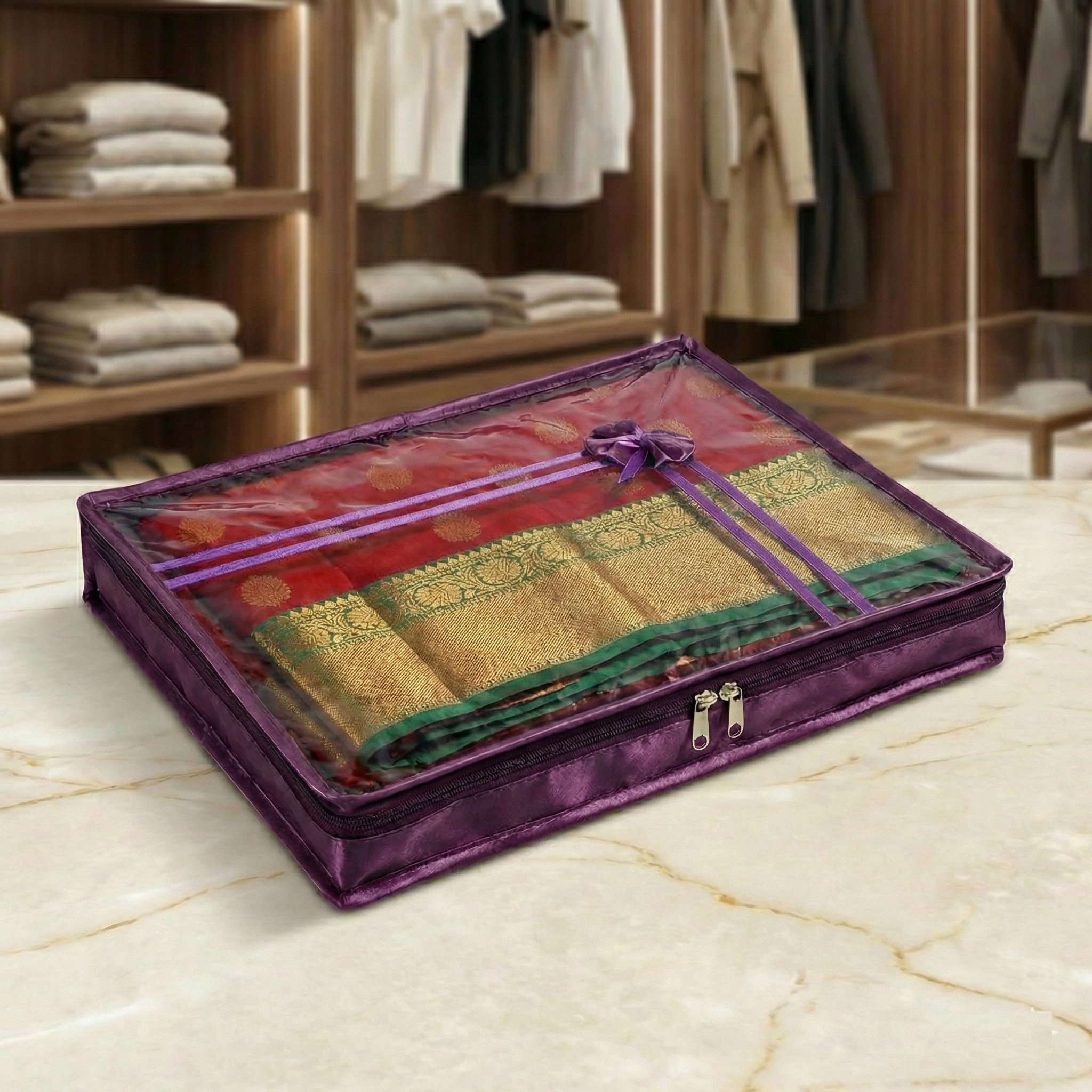 Store one complete saree set or two individual sarees in this elegant 2-inch satin organizer. Designed with premium satin fabric in rich wine purple, it keeps your finest drapes protected and wrinkle-free. Compact dimensions (16.75 x 13.5 inches) fit seamlessly into wardrobes and storage spaces. Perfect for preserving sarees, blouses, and petticoats together. Lightweight at just 88 grams, yet durable enough for everyday use.